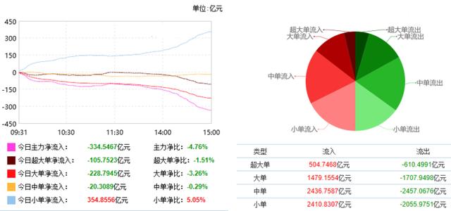 根据东财统计,截止收盘沪深两市呈现资金净流出状态,当日沪深两市资金净流出334.55亿元,今日超大单净流出105.75亿元,大单净流出228.79亿元,中单净流出20.31亿元,小单净流入354.86亿元。