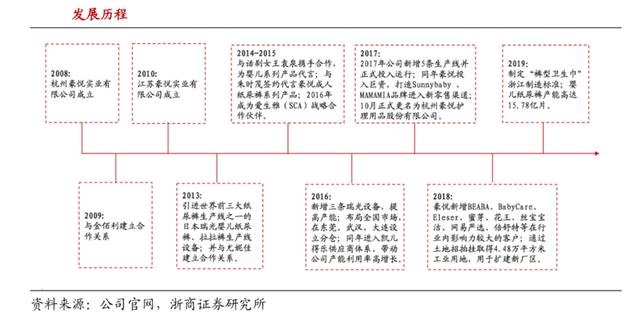 豪悦护理是国内领先的个人卫生护理用品领域制造商,专注于妇、幼、成人个人卫生健康护理用品的研发、制造与销售业务。业务涵盖婴儿纸尿裤、成人纸尿裤、经期裤、卫生巾、湿巾等一次性卫生用品产品,已与多家全球500强企业及国内知名品牌商建立了高端产品研发及 ODM 业务合作。客户包括宝洁、金佰利、尤妮佳、SCA(维达)、花王等跨国公司,以及凯儿得乐、蜜芽、BEABA、BabyCare、子初、Eleser、景兴健护、重庆百亚等国内知名护理用品企业和母婴品牌商。目前公司有2个生产基地,杭州豪悦工厂和江苏豪悦工厂。根据中国造纸协会数据,2016 至 2018 年公司经期裤销售额国内市占率连续三年排名第一。超过40%,婴儿纸尿裤和成人纸尿裤销售额排名国内厂商前列。