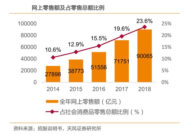吸收性卫生用品传统渠道包括大卖场、大型超市、小超市等网点,新兴渠道包括母婴专营店和专营连锁店、电商平台、垂直电商等。2018全年网上零售额超过9万亿,同比增长25.5%,占全年社会消费品零售总额的比重为23.6%。