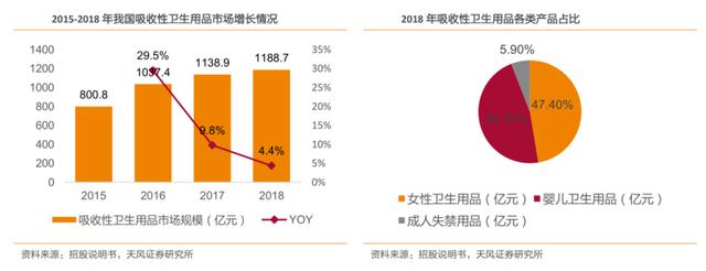 吸收性卫生用品市场逐年增长,女性及婴儿卫生用品消费仍为主力。根据中国造纸协会统计,2018年我国吸收性卫生用品市场规模为1188.7亿元,同比增加4.4%。其中女性卫生用品占比最高,达到47.4%,其次是婴儿卫生用品,占比46.7%,成人失禁用品占比为 5.9%。