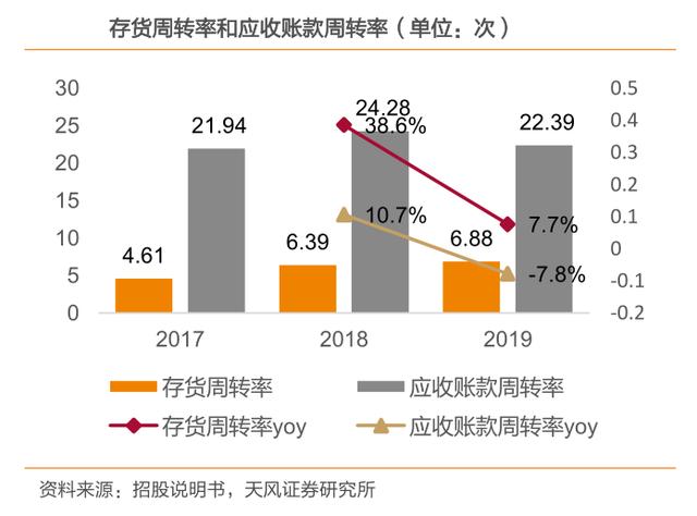 公司存货周转率分别为4.61/6.39/6.88次,增加明显,说明公司不断加强存货管理,存货运营效率逐年提升,库存消化情况良好。应收账款周转率分别为21.94/24.28/22.39 次,稳中有升,国内外市场不断开拓的同时,客户收款力度把控良好。
