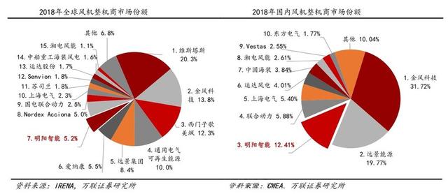 根据CWEA数据,2018年,明阳智能实现新增装机量26.24GW,位列国内第三。公司市场地位稳固,自2013年起至2019年,每年新增装机量始终保持在国内前三名。在此基础上,根据IRENA数据,公司2018年全球市占率达到5.2%,跻身全球风机整机商市场份额第七位。