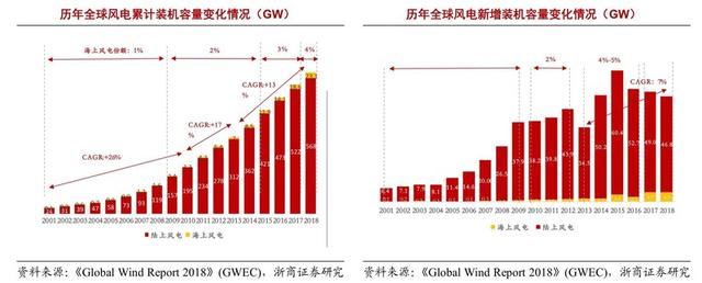 2001-2009年:全球风电高速增长期。2010-2013年:全球风电调整期。2014年至今:全球风电重回发展期。2018年,全球新增装机51.3GW,其中陆上风电新增装机46.8 GW, 海上风电新增装机4.5 GW。截至2018年全球风电累计装机591GW,其中海上风电累计装机23GW,在全球风电装机占比4%。