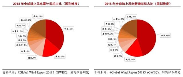 中国:2008-2018年陆上风电新增装机连续十年全球第一。2018年陆上风电新增装机21.2GW,全球占比45%,继续保持 2008 年以来全球第一大陆上风电增量市场。截至2018年,中国陆上风电累计装机206GW,陆上和海上累计装机210.6GW,成为世界首个陆上风电总装机超过200GW的国家,提前两年完成了风电“十三五”规划目标(2020年风电并网 210GW)。