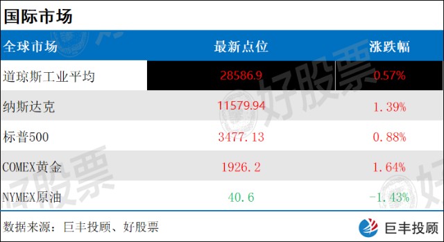 道指涨161.39点,或0.57%,报28586.90点;纳指涨158.96点,或1.39%,报11579.94点;标普500指数涨30.30点,或0.88%,报3477.13点。