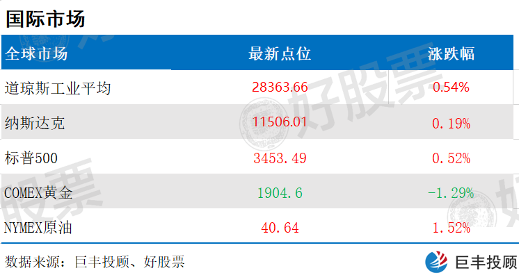 道指涨152.84点,或0.54%,报28363.66点;纳指涨21.31点,或0.19%,报11506.01点;标普500指数涨17.93点,或0.52%,报3453.49点。