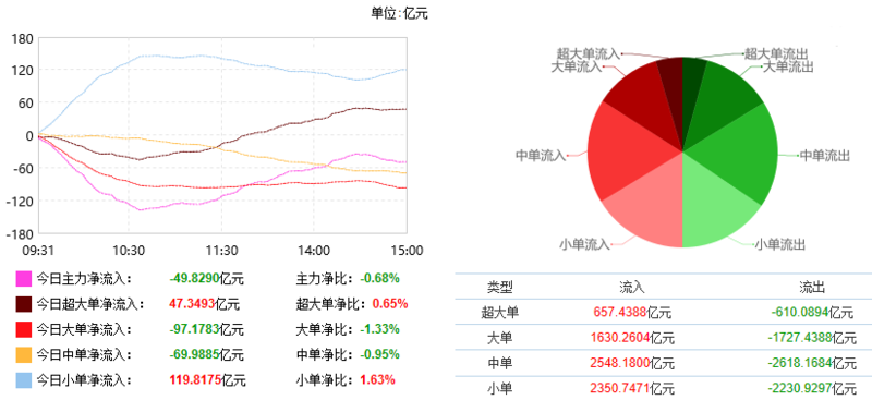 根据东财统计,截止收盘沪深两市呈现资金净流出状态,当日沪深两市资金净流出49.83亿元,今日超大单净流入47.35亿元,大单净流出97.18亿元,中单净流出69.99亿元,小单净流入119.82亿元。