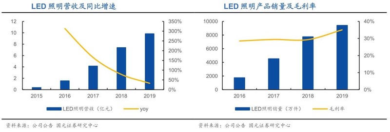 公司2014年进入LED照明领域,把握消费者对视力健康尤其是儿童视力保护日益重视的需求变化,以“爱眼”作为产品定位推出了多款具有防频闪、防蓝光等功能的LED照明产品,2019年LED照明营收9.84亿元,同比增长32.82%;毛利率35.06%,相对于2016年提升6.55pct。