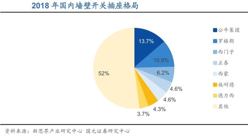 墙壁开关插座格局分散,公司市占率行业第一。墙开企业约有1,400余家制造商的产品通过 3C认证,市场主要企业包括外资品牌有罗格朗、西门子和西蒙等,国内知名品牌有公牛、正泰、德力西和飞雕等,以及很多区域性的小品牌。
