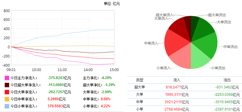 根据东财统计,截止收盘沪深两市呈现资金净流出状态,当日沪深两市资金净流出375.82亿元,今日超大单净流出113.10亿元,大单净流出262.73亿元,中单净流入5.27亿元,小单净流入370.56亿元。