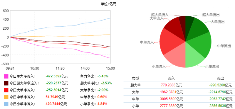 根据东财统计,截止收盘沪深两市呈现资金净流出状态,当日沪深两市资金净流出472.54亿元,今日超大单净流出220.24亿元,大单净流出252.30亿元,中单净流入51.79亿元,小单净流入420.74亿元。
