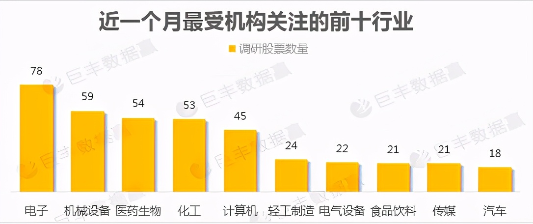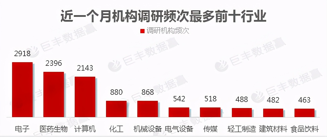 从行业调研数据上看,本月机构重点调研电子、医药生物和计算机等行业,从总量看,电子最受机构关注,调研总量达2918次,其次是医药生物行业调研总量为2396次,计算机行业调研总量为2143次,另外还有诸多行业受到机构密集调研。