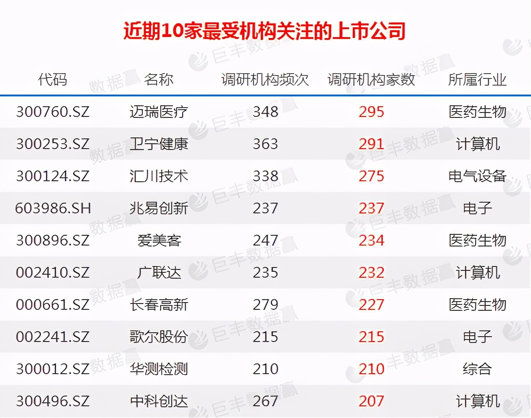 从个股数据看,迈瑞医疗和卫宁健康等十家公司受机构调研次数最多,最受关注。