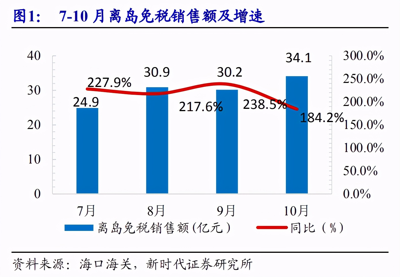新时代证券分析指出,得益于国庆黄金周海南旅游市场的火爆和促销活动助力,10月成为离岛免税新政自7月1日实施以来,单月免税销售额的最高纪录。7月、8月、9月的离岛免税销售金额分别为24.9亿元、30.9亿元、30.2亿元。10月免税品销售的强劲、爆发式增长趋势没有改变,离岛免税销售额达到34.1亿元,同比增长184.2%。