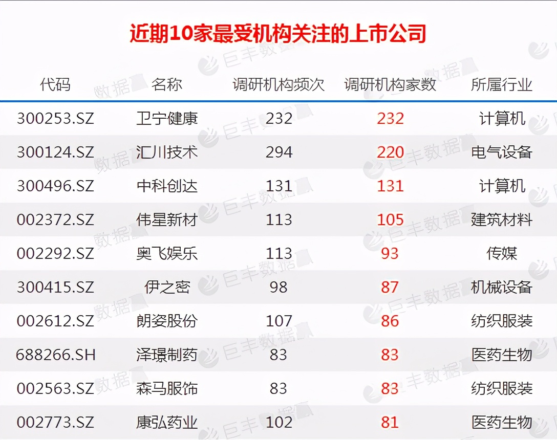从个股数据看,卫宁健康和汇川技术等十家公司受机构调研次数最多,最受关注。