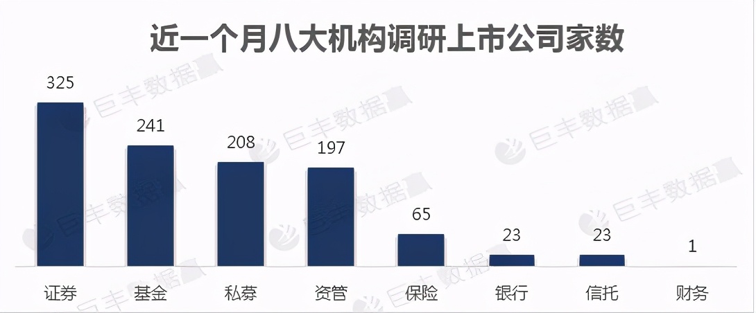 从机构活跃度来看,本月证券公司调研最为活跃,共调研325次,其次是基金公司,调研次数达到241次,另外私募和资管调研数据也比较靠前,分别为208次和197次。