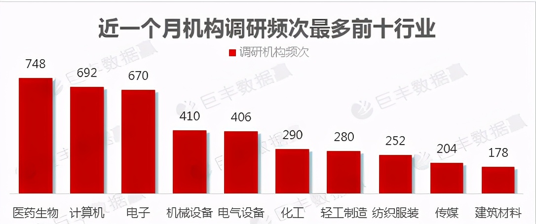 从行业调研数据上看,本月机构重点调研医药生物、计算机和电子等行业,从总量看,医药生物最受机构关注,调研总量达748次,其次是计算机行业调研总量为692次,电子行业调研总量为670次,另外还有诸多行业受到机构密集调研。