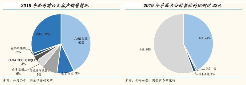 公司是多家全球知名企业的优质合作伙伴,直接客户包括:AMS集团、康宁集团、舜宇集团、麦格纳集团等下游行业龙头,2019年前五大客户销售合计占比 68%。公司最终产品应用于苹果、华为等著名厂商的多款产品中,其中,苹果公司2019年的销售占比高达42%、毛利占比高达58%,是公司最主要的终端客户。