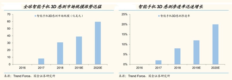 根据 TrendForce 数据,2018 年全球智能手机3D感测市场规模为31亿美元,预计2020年将增至60亿美元,CAGR 为39%;2018 年智能手机3D感测渗透率为8%,预计2020年将增加12pct至20%,每5部智能手机就有一部拥有3D感测功能。长条棱镜业务短期受益苹果产业链景气度向好,长期受益于3D结构光产品渗透率提升。