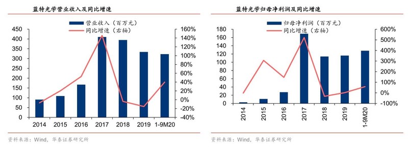 进入2020年,受益于 iPhone、AR 等终端产品需求提升,长条棱镜、玻璃晶圆销售额提高,2020年1Q/2Q/3Q 蓝特营收同比增长96.5%/27.7%/24.8%至 0.90/0.94/1.39 亿元,归母净利润同比增长 345.8%/17.5%/30.7%至 0.37/0.32/0.59 亿元。