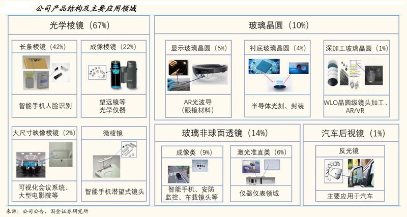 公司在精密玻璃光学元件加工方面具有较强的竞争优势和自主创新能力,掌握了玻璃光学元件冷加工、玻璃非球面透镜热模压、高精密模具设计制造、中大尺寸超薄玻璃晶圆精密加工等多项核心技术,形成了以光学棱镜、玻璃非球面透镜、玻璃晶圆及汽车后视镜等为主的产品体系,应用范围包括智能手机、VR/AR、短焦距投影等消费电子产品,半导体加工,车载镜头,5G光通讯以及高端望远镜、激光器等光学仪器。