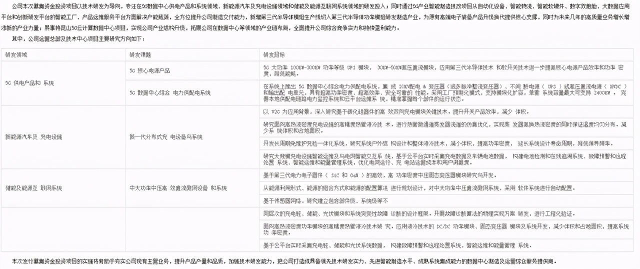 公司今年八月份完成国资入股并在10月底完成新一届领导决策层的换届,随后推出新的融资项目。募集资金投资项目以技术研发为导向,专注在5G数据中心供电产品和系统领域、新能源汽车及充电设施领域和储能及能源互联网系统领域的研发投入。