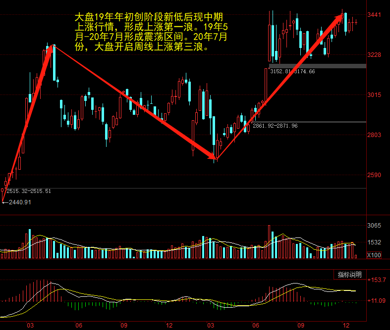 大盘19年第一季度的上涨行情转变为围绕60周均线的中期震荡行情,现进入周线第三浪上涨行情。
