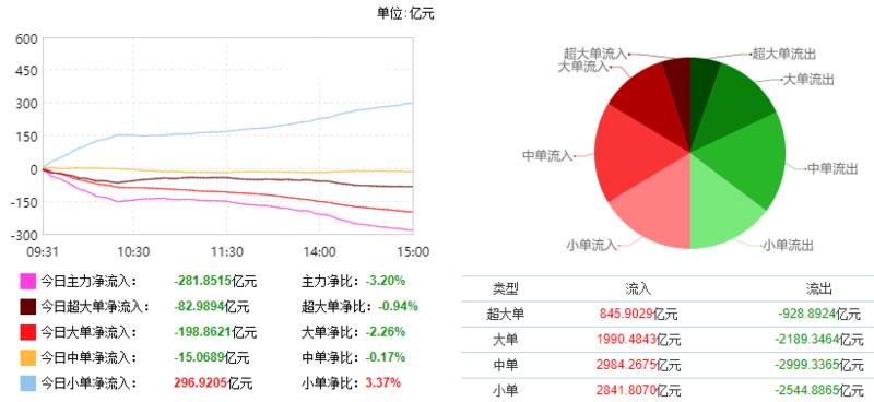 根据东财统计,截止收盘沪深两市呈现资金净流出状态,当日沪深两市资金净流出281.85亿元,今日超大单净流出82.99亿元,大单净流出198.86亿元,中单净流出15.07亿元,小单净流入296.92亿元。