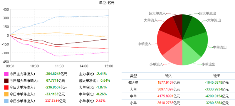 根据东财统计,截止收盘沪深两市呈现资金净流出状态,当日沪深两市资金净流出304.62亿元,今日超大单净流出67.77亿元,大单净流出236.85亿元,中单净流出33.12亿元,小单净流入337.74亿元。