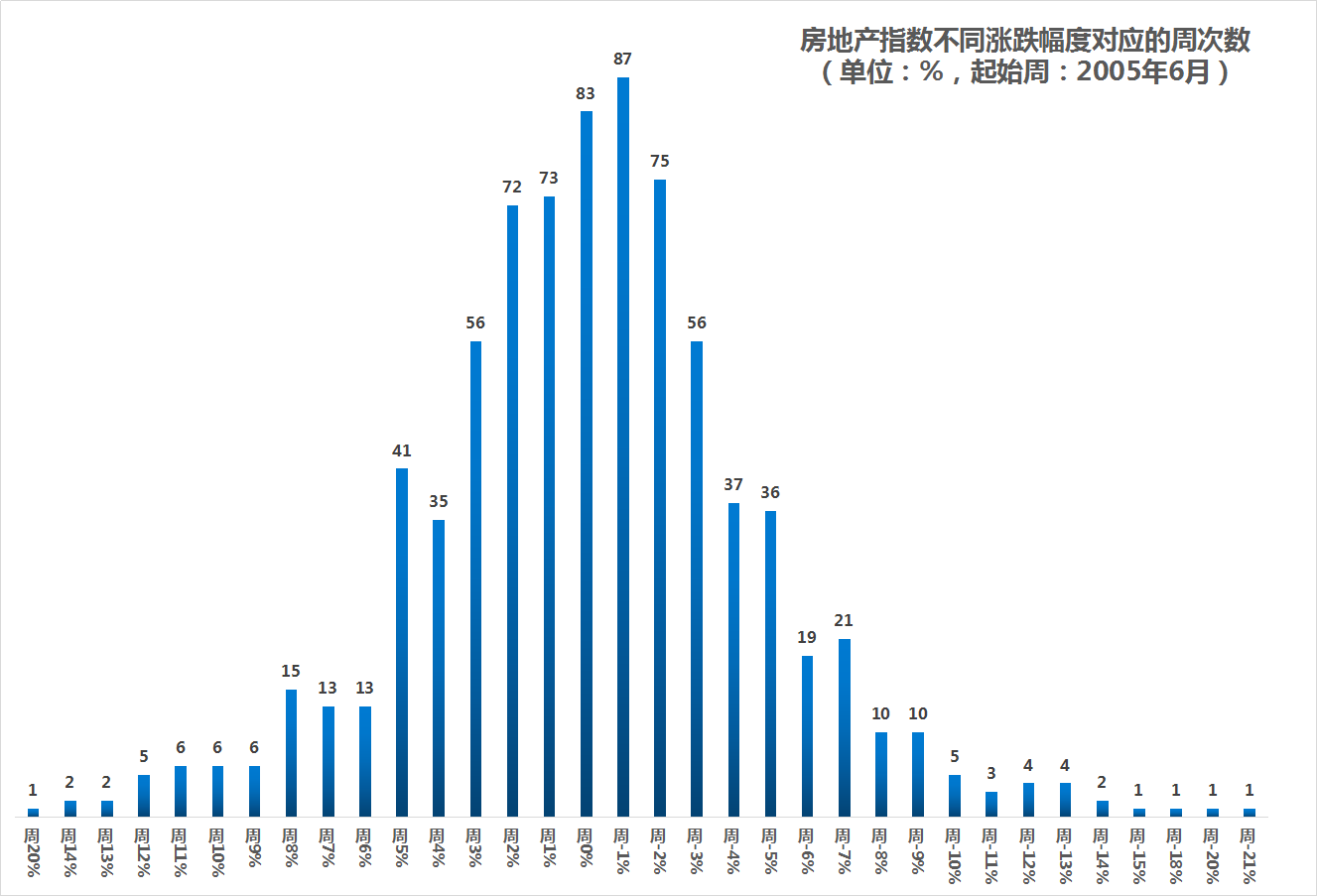 数据统计发现,2005年6月以来,交易周数超过800周。在可统计的802周中,房地产指数周涨幅次数平均集中在-2%至2%之间。涨幅超过5%的周数共有110周,涨幅超过10%的周数有22周。