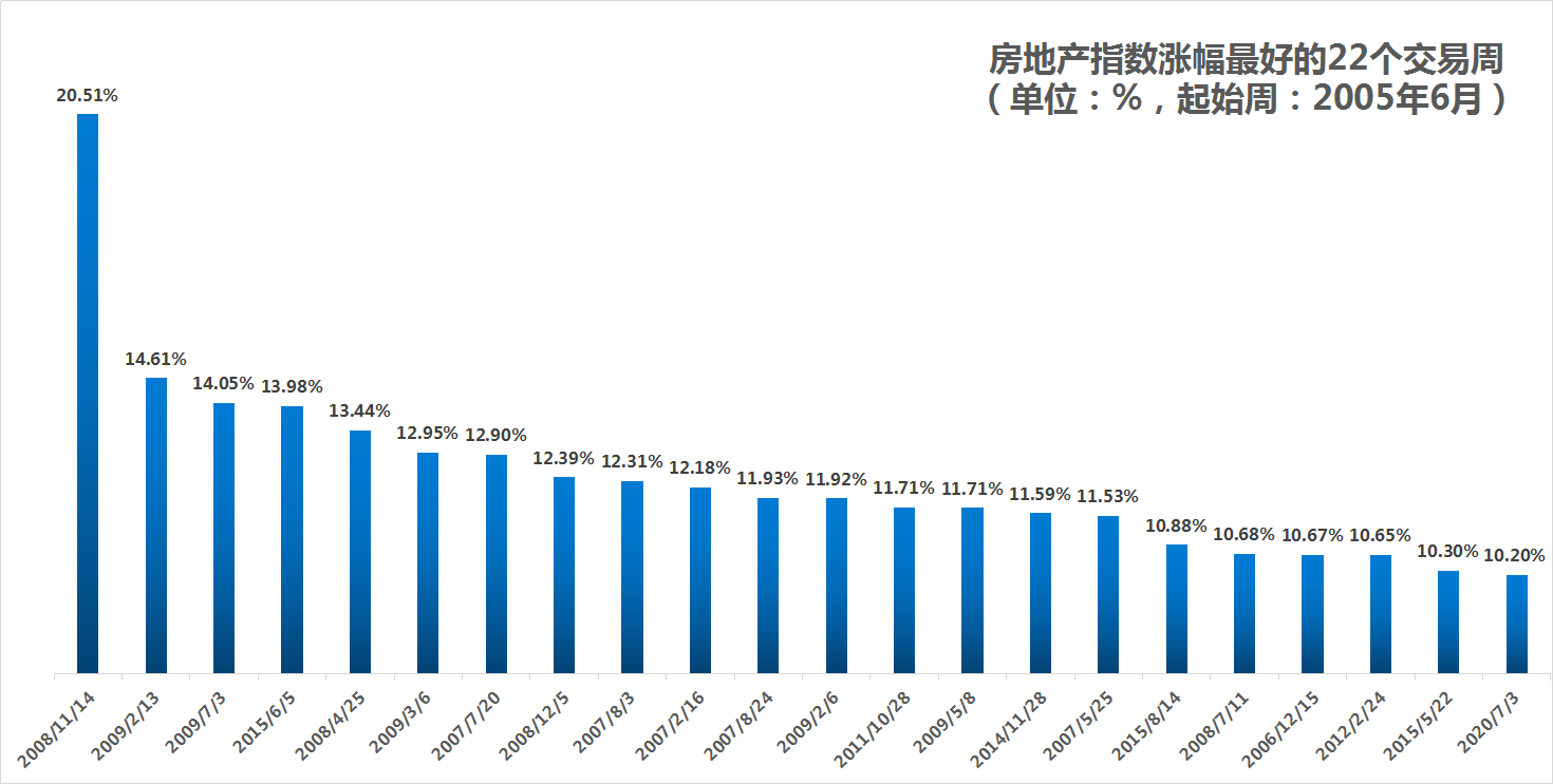 在房地产指数周涨幅超过10%,有一次发生在2020年7月,7月3日当周上涨10.2%,7月10日当周上涨7.65%,连续两周房地产指数增长了20%。随之,数十周时间消化这两周带来的过多涨幅。