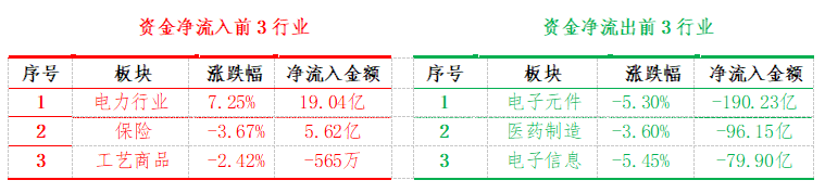 资金净流入前 3 行业 资金净流出前 3 行业 序号板块涨跌幅净流入金额 序号板块涨跌幅净流入金额1电力行业7.25.04亿 1电子元件-5.30%-190.23亿2保险-3.67%5.62亿 2医药制造-3.60%-96.15亿3工艺商品-2.42%-565万 3电子信息-5.45%-79.90亿