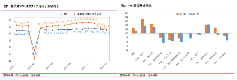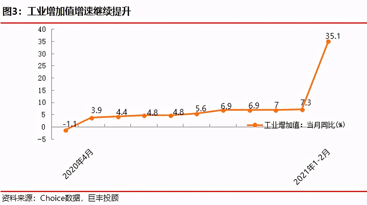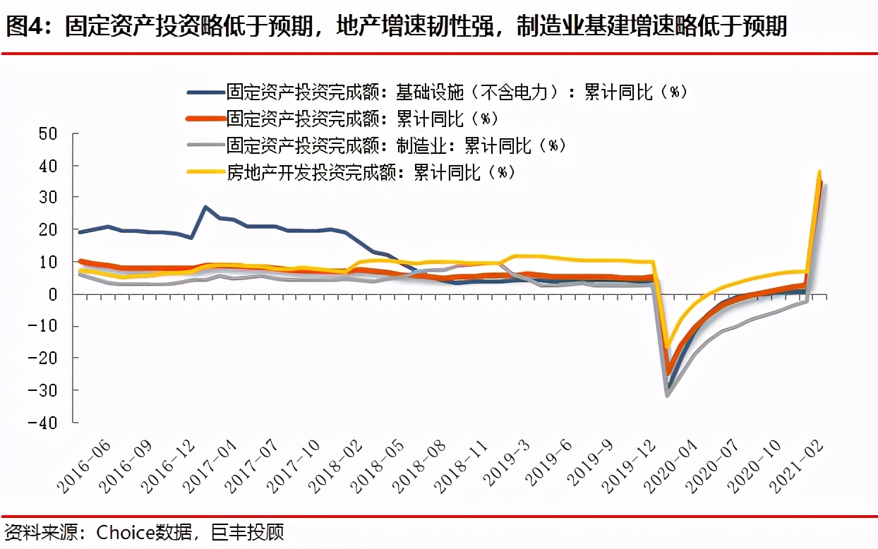 点评:2021 年 1-2 月, 固定资产投资累计增速 35%, 低于市场预期;比 2019 年 1-2 月份增长 3.5%, 低于 2020 年 5 月之后的单月增速。 固投不及预期,主要受制造业和基建拖累,而地产增速则进一步上行。