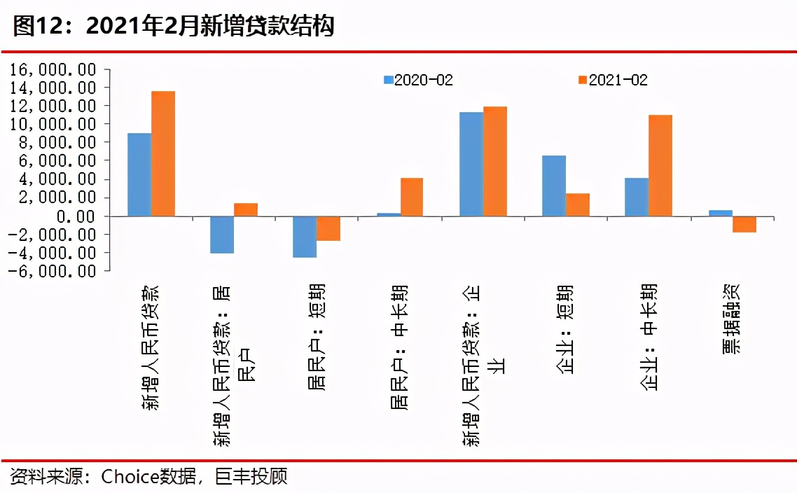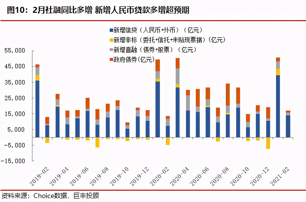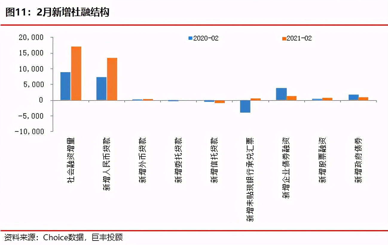 1-2 月房地产投资增速 38.3%, 相对 2019 年同期增长 15.7%,高于 2020 年所有单月同比增速,主因开发商加快推盘和竣工来回流资金,居民房贷资金大幅增加。1-2 月制造业投资增速 37.3%,相对 2019 年同期增长-6.7%,低于 2020 年 5 月及之后的单月增速。 狭义基建投资增速 36.6%,相对 2019 年同期增长-3.2%,低于 2020 年 4 月之后的单月增速。 数据不及预期,主要是受春节前疫情反复及冷冬带来的冲击扰动。