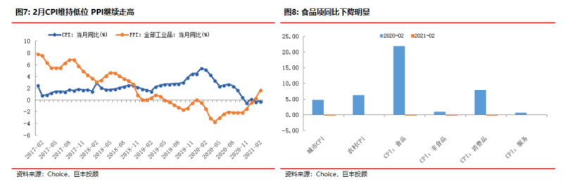 点评:2月尤其前半月是春节消费旺季,物价正常上涨,食品CPI增长1.6%,非食品CPI上涨0.4%。食品中,水产、鲜果、鲜菜、粮油价格上涨,但猪肉和鸡蛋因产量回升价格下跌。非食品中,就地过年带动电影等票价上涨,油价随国际市场回升,春节期间人工成本提高带动多类服务价格回升,但衣着和其他用品服务价格下跌。