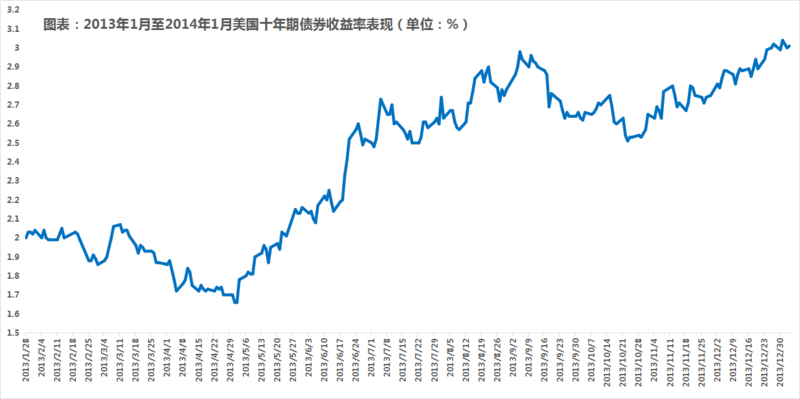 以2013年至2014年的美国十年期国债为例,在时隔9个月后美国国债利率2013年1月再次触及2%,随后美债收益率下行至最低1.66%。当年5月22日,美债收益率再次站上2%,并持续到2014年1月8日的阶段最高3.01%,期间美债收益率上涨50%。