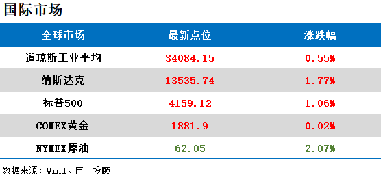 美国市场:美东时间周四,美股集体收高。道指涨近190点,纳指、标普500指数均涨超1%。盘面上,美股大型科技股、抗疫概念股集体上涨,热门中概股多数上涨。截至收盘,道指涨188.11点,涨幅0.55%,报34084.15点;纳指涨236.00点,涨幅1.77%,报13535.74点;标普500指数涨43.44点,涨幅1.06%,报4159.12点。