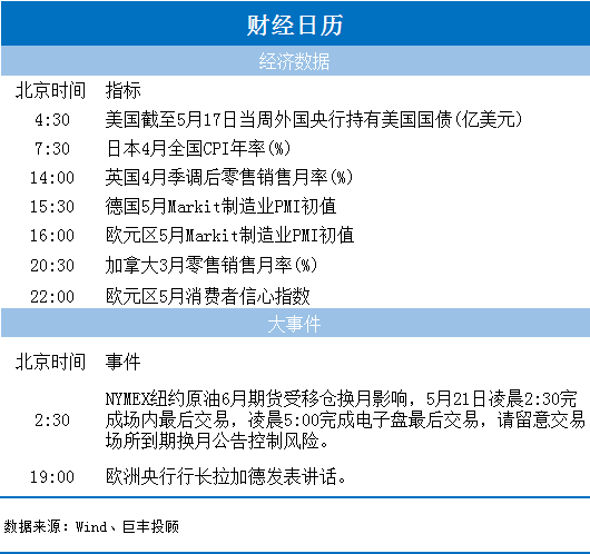 商品市场:国际金价收盘微涨,报于1880美元关口之上。截止收盘,纽约商品交易所黄金期货市场交投最活跃的6月黄金期价20日比前一交易日上涨0.4美元,收于每盎司1881.9美元,涨幅为0.02%。美东时间周四,国际油价收跌,美油、布油均跌逾2%。截止收盘,纽约6月原油期货收跌1.31美元,跌幅2.07%,报62.05美元/桶。布伦特7月原油期货收跌1.55美元,跌幅2.33%,报65.11美元/桶。