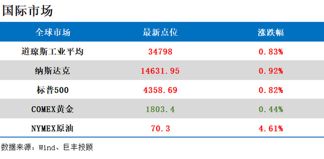 国际油价显著上涨,美、布两油期货均涨超4%。截止收盘,纽约9月原油期货结算价为70.30美元/桶,上涨3.10美元,涨幅4.61%;布伦特9月原油期货结算价为72.23美元/桶,上涨2.88美元,涨幅4.15%。