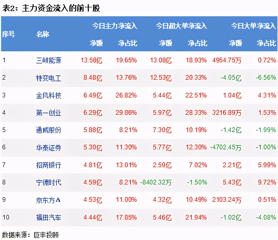 从两市个股主力资金流向来看,三峡能源获主力资金净流入13.58亿,特别电工或主力资金8.48亿净流入,金风科技获主力资金净流入6.49亿,第一创业获主力资金净流入6.29亿,通威股份获主力资金净流入5.88亿,华泰证券获主力5.30亿资金净流入。