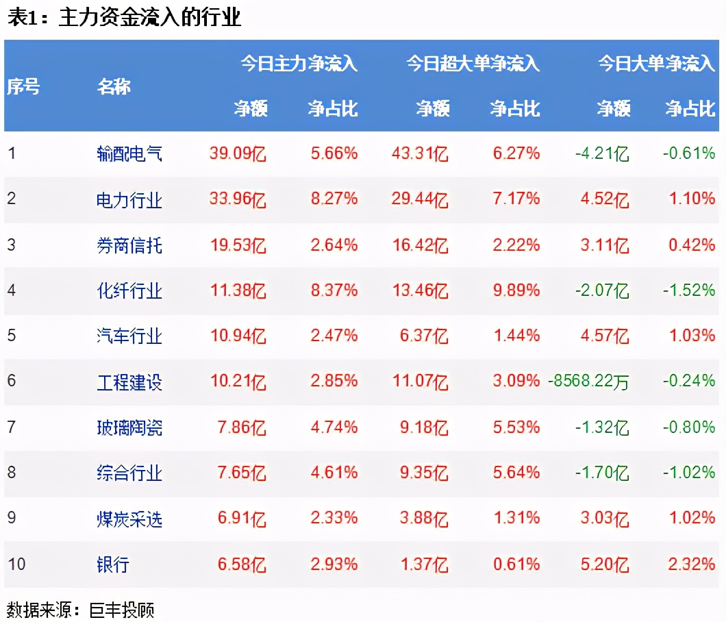 从两市行业板块资金流向来看,输配电气板块获主力资金净流入39.09亿,电力板块获主力资金净流入33.96亿,券商信托板块主力资金净流入19.53亿,化纤板块主力资金净流入11.38亿,汽车板块主力净流入10.94亿。