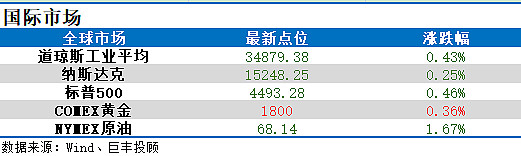 商品市场:美东时间周四,国际油价下跌,截止收盘,纽约10月原油期货收跌1.16美元,跌幅1.67%,报68.14美元/桶;布伦特11月原油期货收跌1.15美元,跌幅1.58%,报71.45美元/桶。国际金价上涨,截止收盘,纽约商品交易所黄金期货市场交投最活跃的12月黄金期价9日比前一交易日上涨6.5美元,收于每盎司1800美元,涨幅为0.36%。