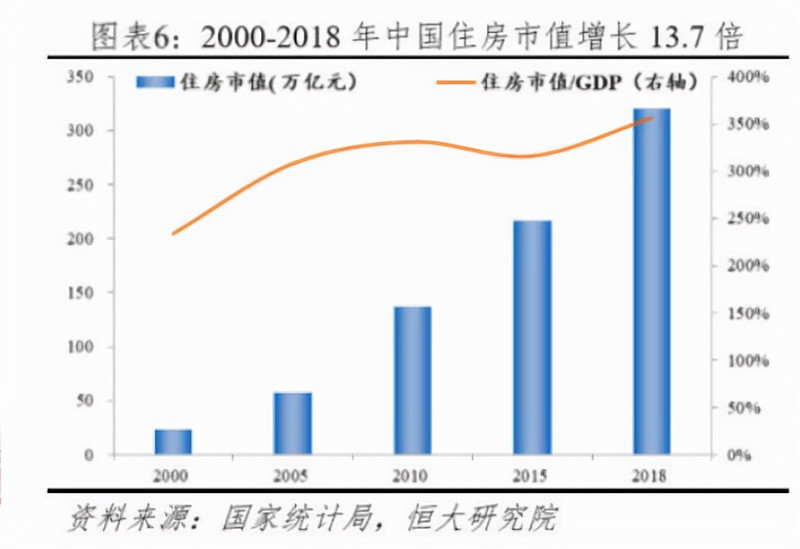 据恒大研究院预测,2000-2018年,中国住房市值从23万亿元增加到321万亿元,年均增长15.7%,住房市值占GDP的比例已经达到了356.7%。