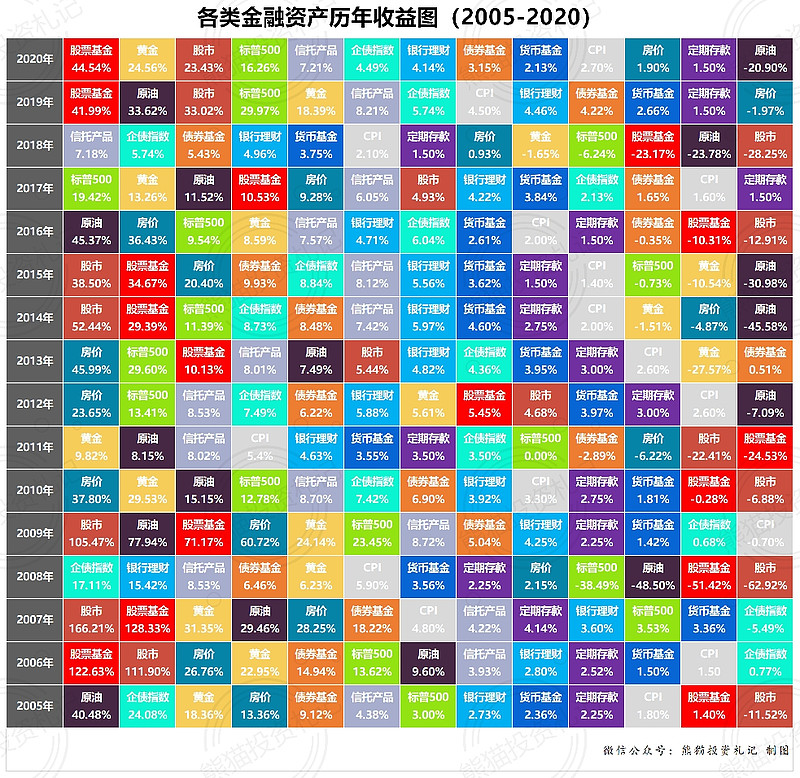 2005年~2020年各类资产的收益率图在网上流传,综合起来出现在前列的就是股票、房产。