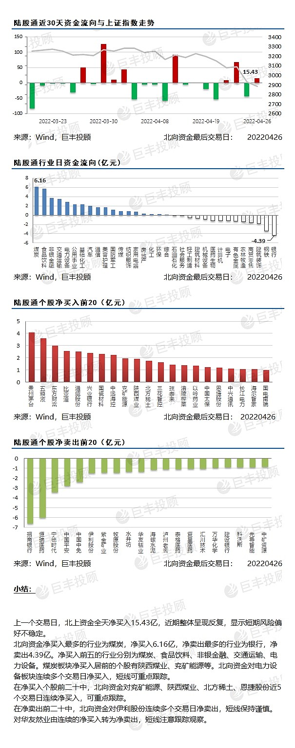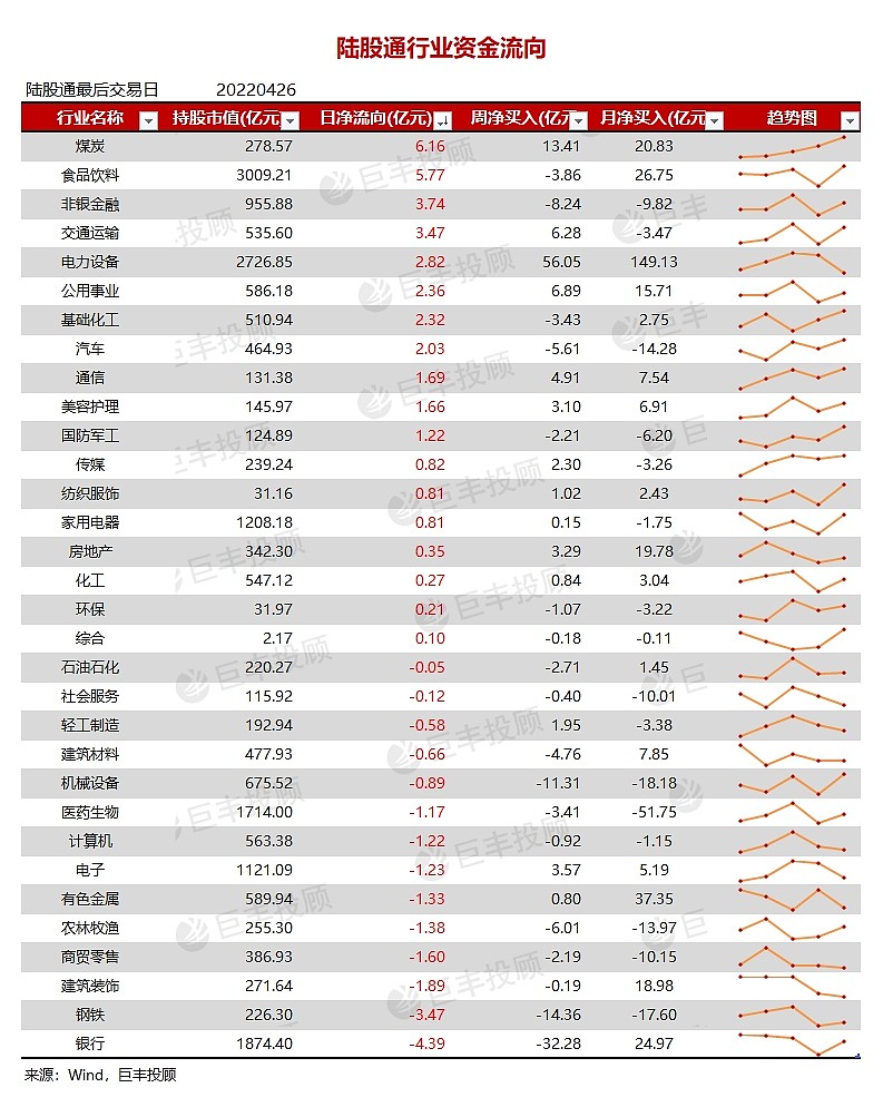 北向资金净买入最多的行业为煤炭,净买入6.16亿,净卖出最多的行业为银行,净卖出4.39亿。净买入前五的行业分别为煤炭、食品饮料、非银金融、交通运输、电力设备。煤炭板块净买入居前的个股有陕西煤业、兖矿能源等。北向资金对电力设备板块连续多个交易日净买入,短线可重点跟踪。