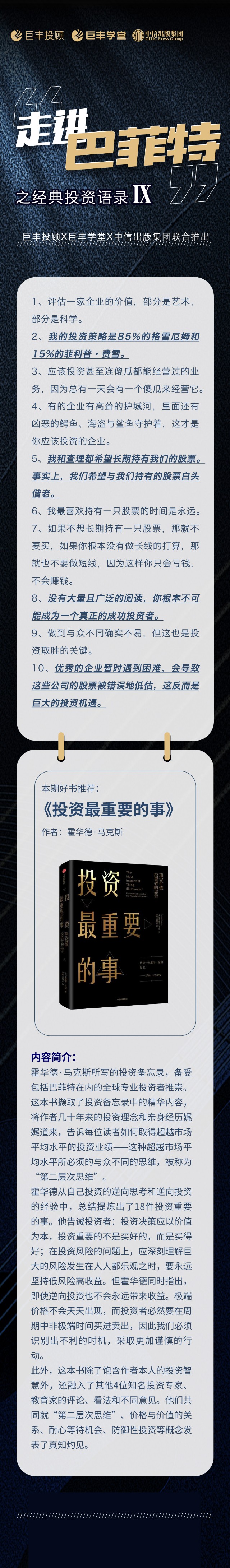 巴菲特,一直是资本市场的风向标,他的投资思想被无数投资者追随。巨丰投顾、巨丰学堂、中信出版集团联合推出“走进巴菲特”系列内容栏目、“共读经典好书”活动,传递“股神”巴菲特价值投资理念,提升投资者财商思维。