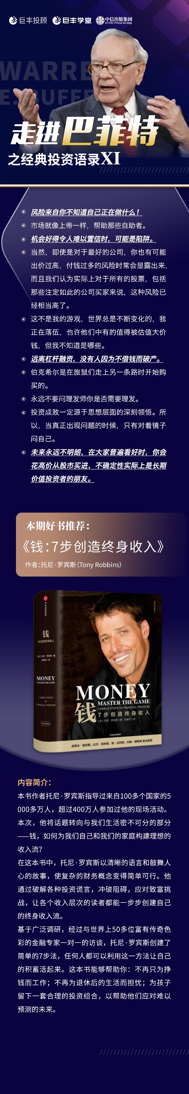 巴菲特,一直是资本市场的风向标,他的投资思想被无数投资者追随。巨丰投顾、巨丰学堂、中信出版集团联合推出“走进巴菲特”系列内容栏目、“共读经典好书”活动,传递“股神”巴菲特价值投资理念,提升投资者财商思维。