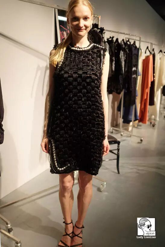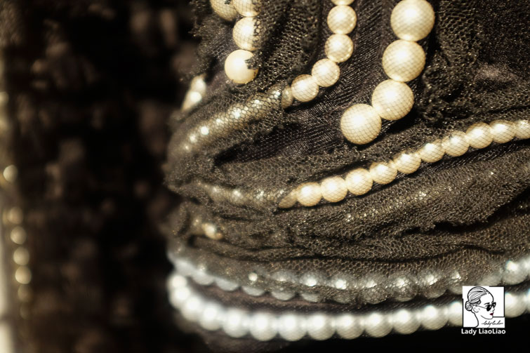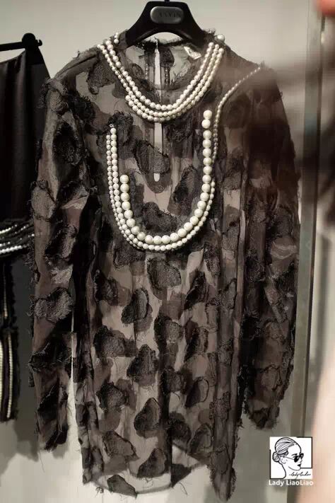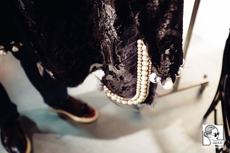 这件以珍珠镶嵌的连衣裙简直就是天使与魔鬼的结合,带有浓厚朋克装扮的黑色蕾丝配上典雅的珍珠,这让我想到经典都有异曲同工之妙:当年Coco