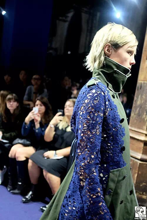 A:Sacai!我真的很长时间没有看到这样令我振奋的秀了,上次是在06年的AlexanderMcqueen的秋冬秀场上,喜欢Kate Moss也是原因之一,她以3D全息影像出场的那一瞬间,我真的被震撼到了。不过Sacai完全是以服装的设计震撼到我,军装大衣与蕾丝完美地融合在一起,谁能想得到呢?