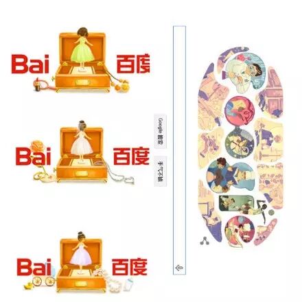 ▲然而到了百度的Doodle,却是被口红、珠宝、结婚戒指、婴儿车等包围的娃娃来影射女人一生的不同阶段,仅把女性的价值体现在了打扮和生育带孩子上,对于职业生涯却没有任何描述。(在豆瓣曾看到条广播:楼主说和某互联网大公司合作画妇女节用的插画,原稿是各行各业高矮胖瘦女性,文案是“做你喜欢的自己”。最后被毙,换成小女人在花丛中喝茶,文案是你值得呵护。唉…)